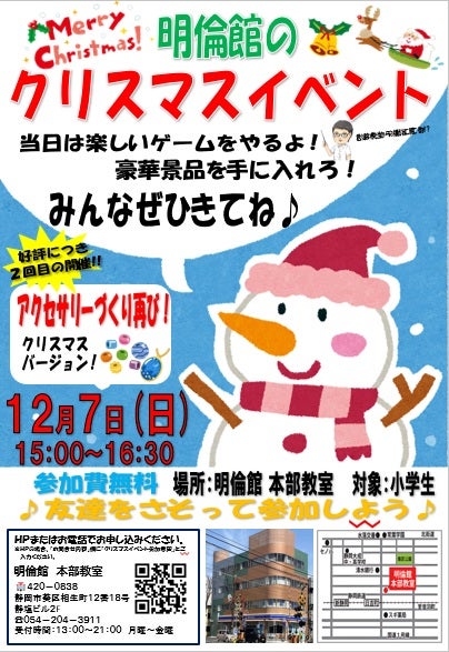 クリスマスイベントのお知らせ 2025年11月23日 最終更新日時 : 2025年11月27日 nagakurahideki こんにちは。 明倫館本部教室です。 もう11月もあと一週間ほどになりますね。 そして早いものでもう12月となります。 12月は、いろいろな楽しいイベントがございますね。 そこで!! 明倫館では、12月7日(日)にクリスマスイベントを開催いたします! 参加申し込み受付中です! 明倫館本部教室 ☎054-204-3911 是非とも、お友達を誘って参加してみてはどうでしょう。