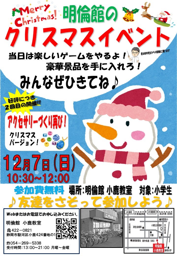 クリスマスイベントのお知らせ 2025年11月23日 最終更新日時 : 2025年11月27日 nagakurahideki こんにちは。 明倫館小鹿教室です。 もう11月もあと一週間ほどになりますね。 そして早いものでもう12月となります。 12月は、いろいろな楽しいイベントがございますね。 そこで!! 明倫館では、12月7日(日)にクリスマスイベントを開催いたします! 参加申し込み受付中です! 明倫館小鹿教室 ☎054-269-5338 是非とも、お友達を誘って参加してみてはどうでしょう。