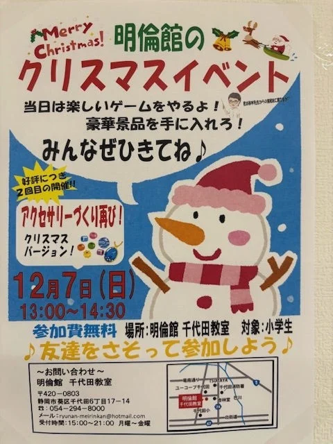 クリスマス会のお知らせ! 2025年11月24日 最終更新日時 : 2025年11月27日 nagakurahideki 12月7日(日) 13:00~14:30 千代田教室にて楽しいクリスマスイベントを行います! 塾生じゃなくても参加できるのでぜひ!豪華景品もありますよ! 同日の別時間で他の教室も行ってますのでぜひ! 担当:村上 冬期講習も募集中!!