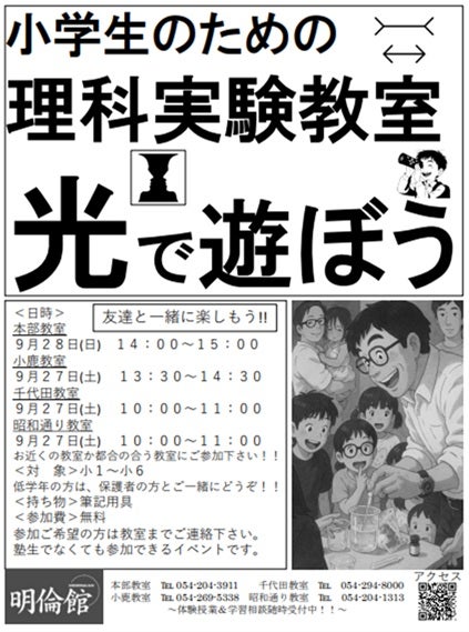 明倫館小鹿教室理科実験教室のお知らせ 2025年9月18日 最終更新日時 : 2025年11月3日 nagakurahideki 明倫館小鹿教室のブログをご覧いただき誠にありがとうございます。 明倫館小鹿教室の永倉でございます。 今回は、理科実験教室のお知らせです。 明倫館小鹿教室では、9月27日(土)の13:30~14:30で実施します。 今回のテーマは 「光で遊ぼう!!」です。 塾生でなくても参加できるオープンイベントです。 参加費はもちろん無料です。 気軽にご参加下さい。 明倫館の他の教室でも日時違いで実施します。 興味のある方は気軽に参加して下さい。 明倫館小鹿教室 教室長 永倉秀樹 TEL054-269-5338